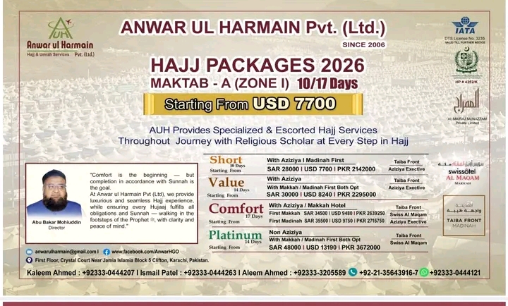 Anwar ul Harmain offers a luxurious, comfortable journey, guided by renowned scholar Mufti Abu Bakar Mohiuddin, ensuring spiritual and religious support at every step.